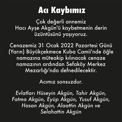 www.istanbulgercegi.com ailesi olarak Merhume Hacı Ayşe Akgün'e Allah'tan Rahmet, ailesi sevenlerine başsağlığı diliyoruz.