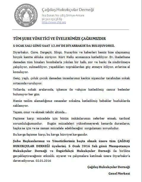 Çağdaş Hukukçular Derneği; Mezopotomya Hukukçular Derneği ve Özgürlükçü Hukukçular Derneği ile birlikte 5 Ocak Salı günü gerçekleştireceği etkinlik ve ziyaretlerine katılım için bir çağrı yayımladı.