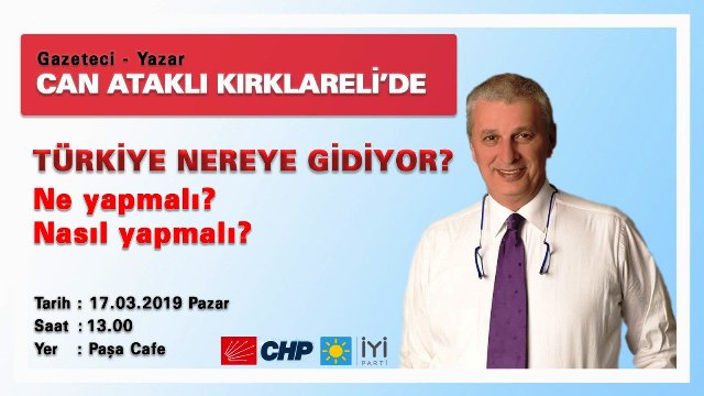 Korkusuz gazetesi yazarı ve Tele1 televizyonu sabah yorumcusu Can Ataklı, CHP ve İYİ Parti'nin Kırklareli Merkez İlçe Yönetimlerinin ortaklaşa düzenlediği "Türkiye nereye gidiyor? Ne Yapmalı? Nasıl Yapmalı?" konulu söyleşiye konuşmacı olarak katılacak.