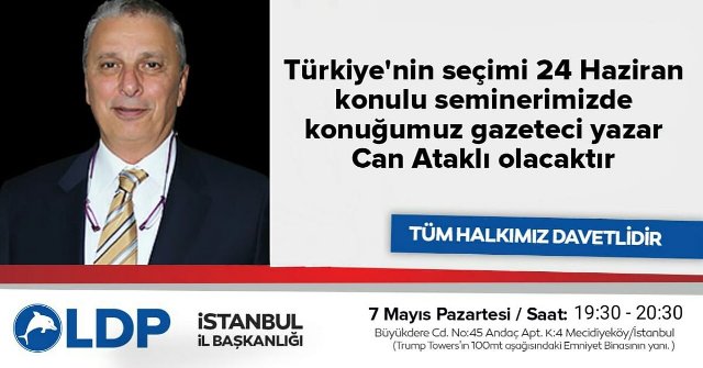 Gazeteci yazar Can Ataklı, Liberal Demokrat Parti (LDP) İstanbul İl Başkanlığı'nın düzenlediği "Türkiye'nin seçimi 24 Haziran" konulu seminere konuşmacı olarak katılacak.