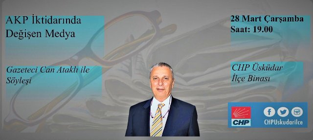 Gazeteci yazar Can Ataklı, CHP Üsküdar İlçe Başkanlığı tarafından düzenlenen 'AKP İktidarında Değişen Medya' konulu söyleşiye konuşmacı olarak katılacak.
