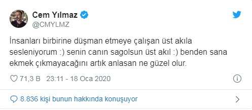 Ünlü komedyen Cem Yılmaz, sosyal medyada kendisine yönelik başlatılan ve #CemYılmazaBoykot hastagi ile gündem olan 'Boykot' çağrısının ardından kişisel Twitter hesabından dikkat çeken bir paylaşımda bulundu.