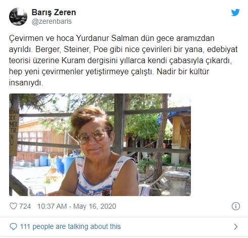 Yurdanur Salman’ın ölüm haberini akademisyen ve çevirmen Barış Zeren, Twitter hesabından şu ifadelerle duyurdu: