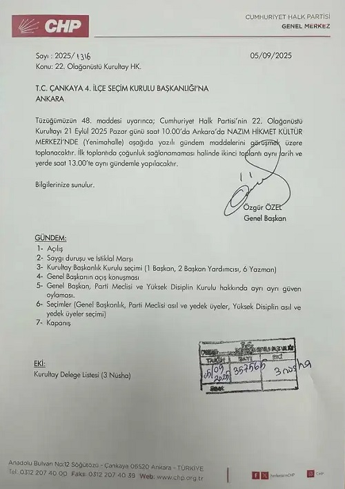 Cumhuriyet Halk Partisi'nin 22. Olağanüstü Kurultayı, 21 Eylül'de Ankara'da yapılacak. Kurultaydan önce CHP Genel Başkanı Özgür Özel, Merkez Yönetim Kurulu ve Merkez Disiplin Kurulu için güven oylaması yapılacak.