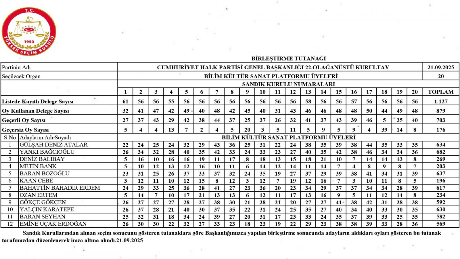 CHP'nin Nazım Hikmet Kültür Merkezi'nde yapılan 22'nci Olağanüstü Kurultayı'nda Parti Meclisi ve Yüksek Disiplin Kurulu seçim sonuçları açıklandı. Blok listeyle yapılan seçimde, 6 Nisan'da göreve gelen PM ve YDK'da birer üye değişti. Oy kullanan delege sayısı 878 iken, 815 geçerli oy kullanıldı. Yurtdışında olan Hakan Uyanık yerine Sercan Çığgın Parti Meclisi üyesi olurken, Çankaya İlçe Başkanı olduğu için YDK'daki görevinden ayrılan Ali Balta yerine ise Edirne İl Başkanlığını yürüten Harika Taybıllı Yüksek Disiplin Kurulu üyeliğine geldi.