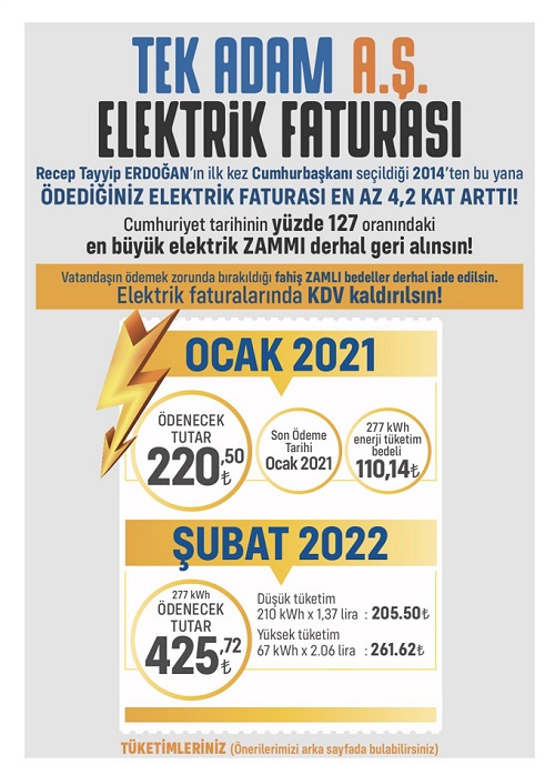 "9 Şubat 2022 Çarşamba günü saat 11.00'de iktidarın dayattığı elektrik zamlarını protesto etmek için tüm Türkiye’de tüm İllerimizde eş zamanlı basın açıklamamızı yapacağız.