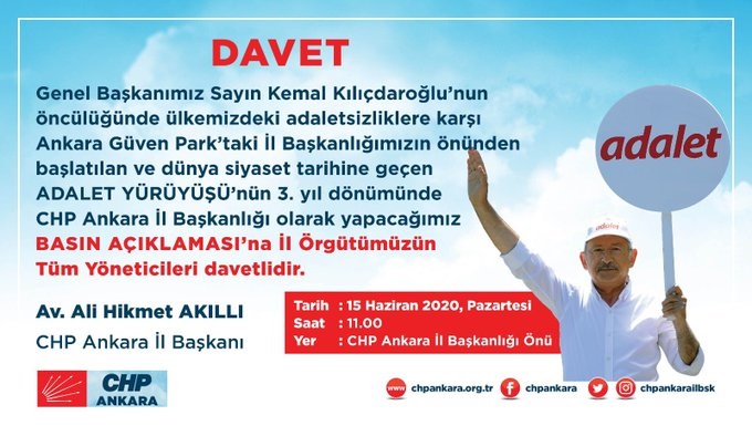 CHP Genel Başkanı Kemal Kılıçdaroğlu'nun Güvenpark'tan başlattığı Adalet Yürüyüşü'nün 3. yılı dolayısıyla Ankara'da CHP Ankara il başkanlığı 15 Haziran Pazartesi günü basın açıklaması yapacak.