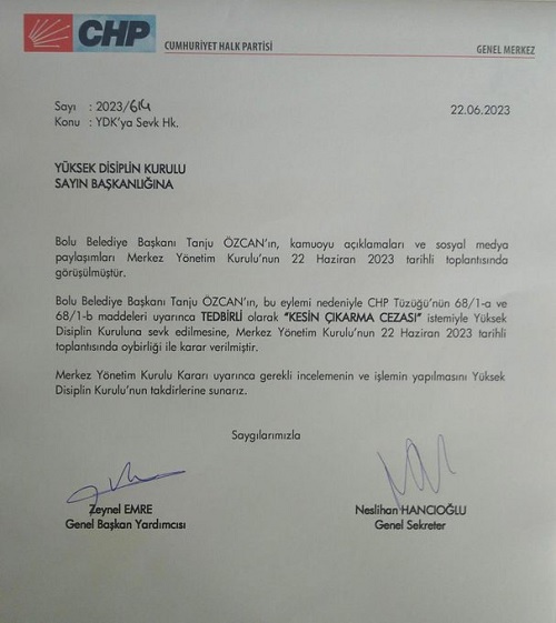 Bolu Belediye Başkanı Tanju Özcan, 22 Haziran'da toplanan MYK toplantısında CHP Tüzüğünün 68/1-a ve 68/1-b maddeleri uyarınca tedbirli olarak "Kesin Çıkarma Cezası" istemiyle Yüksek Disiplin Kuruluna sevk edildi.