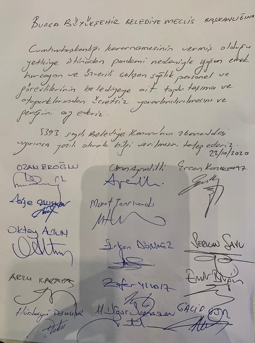 "Başta İstanbul olmak üzere CHP'li büyükşehir belediyelerimiz sağlık personelinin toplu ulaşımın yanı sıra otopark hizmetlerinden de ücretsiz yararlanmasını sağladı. AKP'li Bursa Büyükşehir Belediyesi'nin de sağlık personeline bu hakkı sağlaması için konuyu 8 ve 21 Ekim'deki açıklamalarımızda ele almış, önerge vererek meclis gündemine taşıyacağımızı da ifade etmiştik. 22 Ekim tarihli Büyükşehir Belediye Meclisi toplantısında CHP grubumuz tarafından ilgili önerge verilmiştir."