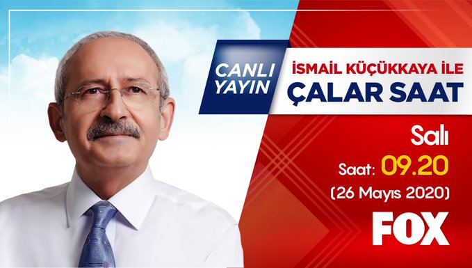 CHP Lideri Kemal Kılıçdaroğlu, 26 Mayıs 2020 Salı, Saat 9.20'de, Fox TV canlı yayınında İsmail Küçükkaya ile Çalar Saat programına konuk olacak.