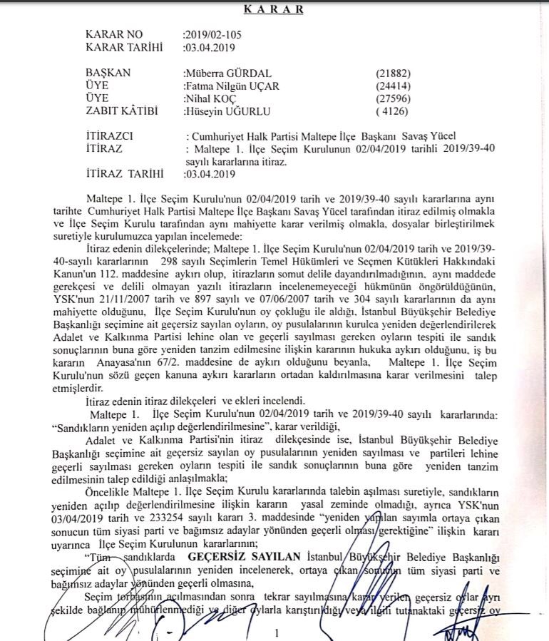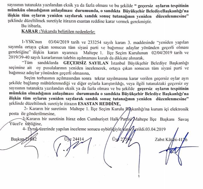 ❎İstanbul İl Seçim Kurulu Maltepe’deki oyların tamamının sayılması kararını iptal ederek sadece geçersiz olanlarının sayılması gerektiğine karar verildi.