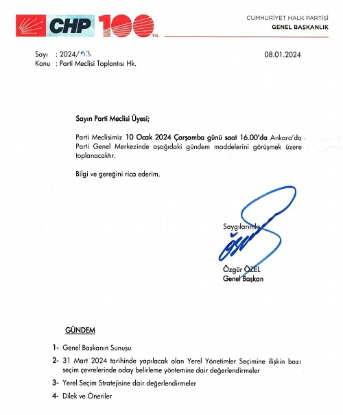 Cumhuriyet Halk Partisi Genel Başkanı Özgür Özel 10 Ocak 2024 Çarşamba günü MYK ve Parti Meclisine CHP Genel Merkezinde başkanlık edecek.