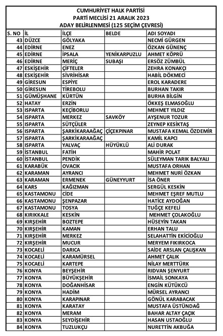CHP Parti Meclisi 21 Aralık 2023 Perşembe günü yaptığı toplantıda 3 Büyükşehir Belediye Başkan adayını açıkladı. Konya, Manisa, Samsun, 6 İl Belediye başkanı; Çanakkale, Kırşehir, Bartın, Amasya, Kütahya ve Ardahan adaylarını açıkladı.