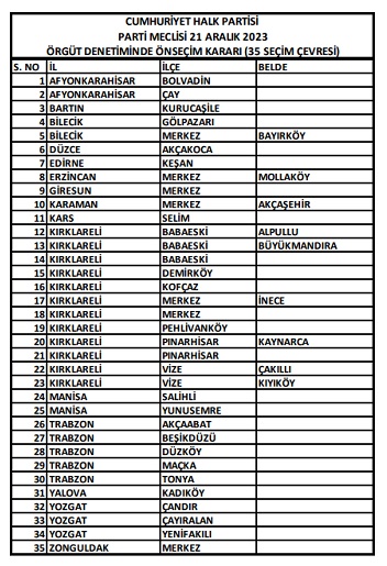 Cumhuriyet Halk Partisi Parti Meclisi 21 Aralık 2023 Perşembe günü Belediye Başkan adayları için 35 bölgede ön seçim kararı aldı.