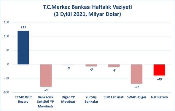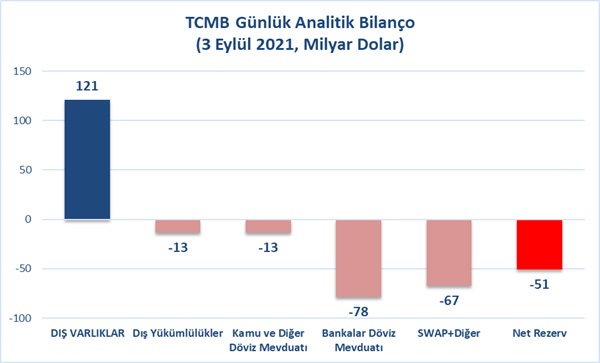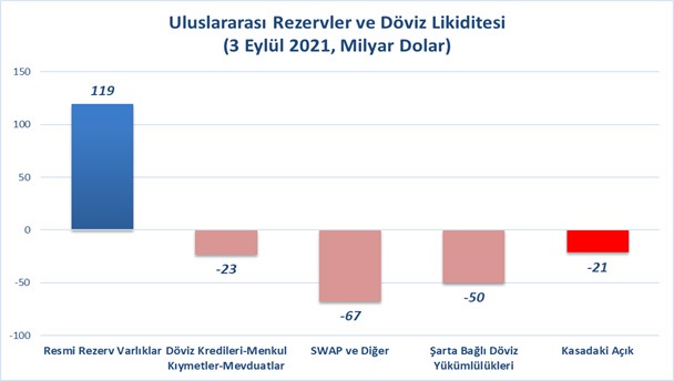 İlk grafik, bu TCMB tarafından IMF standartlarına göre hazırlanan, “Uluslararası Rezervler ve Döviz Likiditesi” tablosundan üretildi. Bu tablo: Merkez Bankası’nın brüt döviz rezervlerinden vadesi bir yıldan daha az olan, döviz kredileri, döviz borçları, SWAP anlaşmalarıyla alınan emanet dövizler ve diğer koşullu döviz borçları düşüldüğünde kasada ne var onu gösteriyor. 3 Eylül 2021 itibariyle; IMF’den alınan son 6 milyar 300 milyon dolarlık destekte dahil burada düşülmüyor, döviz kasasında 21 milyar dolar açık var açık. Yani kısa vadeli yükümlülüklerimizi karşılayamıyoruz.