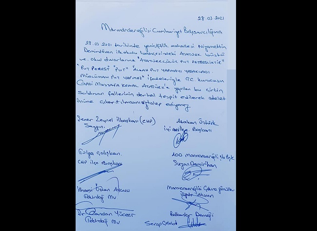 CHP Tekirdağ Milletvekili İlhami Özcan Aygun yaptığı açıklamada; "Andımızın kaldırılması ve madalyalardan Atatürk kabartmasının çıkarılmasının ardından Marmara Ereğlisi'ndeki Yeni Çiftlik İlköğretim Okulu'nda Atatürk büstünün üzerine "Atatürkçülük putperestliktir" ibareli kin dolu yazı bırakıldı. Atatürk'u silemezsiniz.