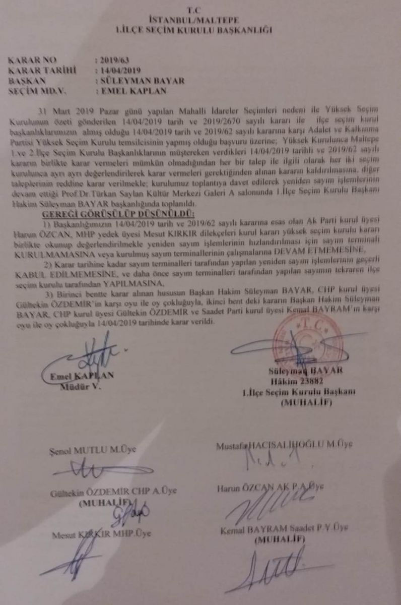 YSK'nın 14.04.2019 tarih ve 2019/2670 sayılı kararı ve ilçe seçim kurul başkanlığının 14.04.2019 tarih ve 2019/62 sayılı kararına karşı Adalet ve Kalkınma Partisi Yüksek seçim kurulu temsilcisinin yaptığı başvuru üzerine; Yüksek Kurulunca Maltepe 1. ve 2. Seçim Kurulu Başkanlıklarının müştereken verdikleri 14.04.2019 tarihli ve 2019/62 sayılı kararın birlikte karar vermeleri mümkün olmadığından her bir talep ile ilgili olarak her iki seçim kurulunca ayrı ayrı değerlendirilerek karar vermeleri gerektiğinden alınan kararın kaldırılmasına, diğer taleplerinin reddine karar verilmekle; kurulumuz toplantıya davet edilerek yeniden sayım işlemlerinin devam ettiği Prof. Dr. Türkan Saylan Kültür Merkezi Galeri A salonunda 1. ilçe Seçim Kurulu Başkanı Hakim Süğleymen Bayar başkanlığında toplandı...