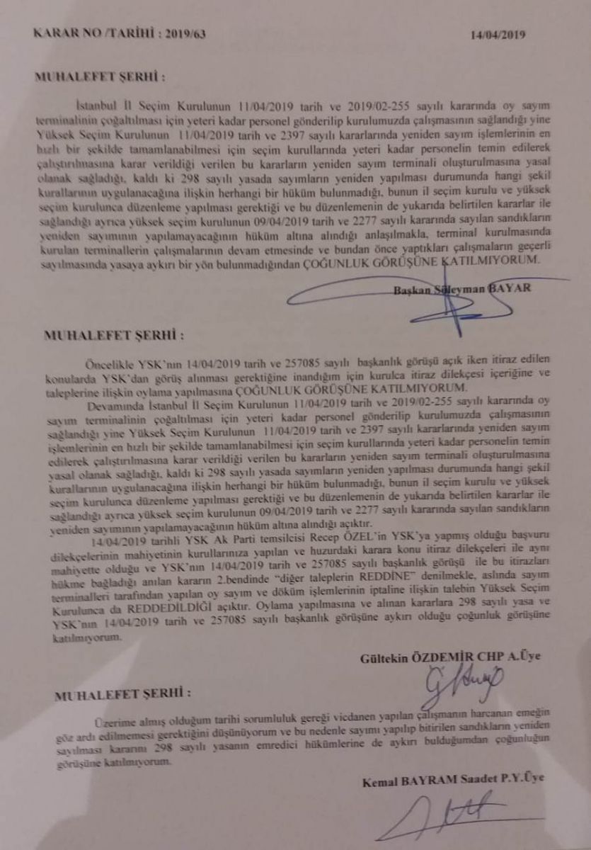 3- Birinci bentte karar alınan hususun Başkan Hakim Süleyman Bayar, CHP kurul üyesi Gültekin Özdemir'in karşı oyu ile oy çokluğuyla, ikinci bent deki kararın Başkan Hakim Düleyman Bayar, CHP kurul üyesi Gültekin Özdemir ve Saadet Partisi kurul üyesi Kemal Bayram'ın karşı oyu ile oy çokluğuyla 14.04.2019 tarikinde karar verildi...
