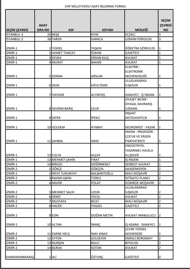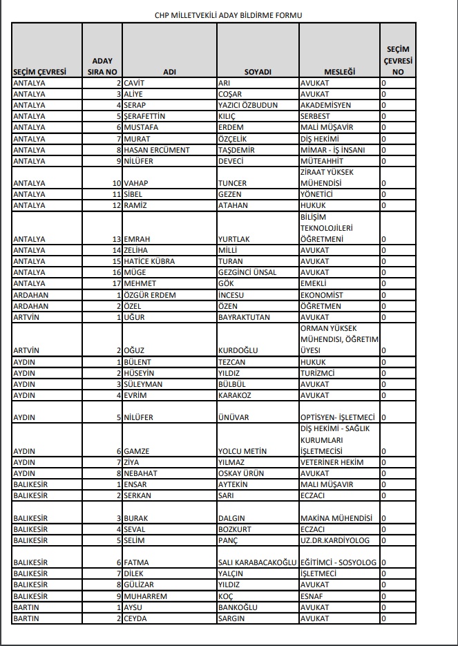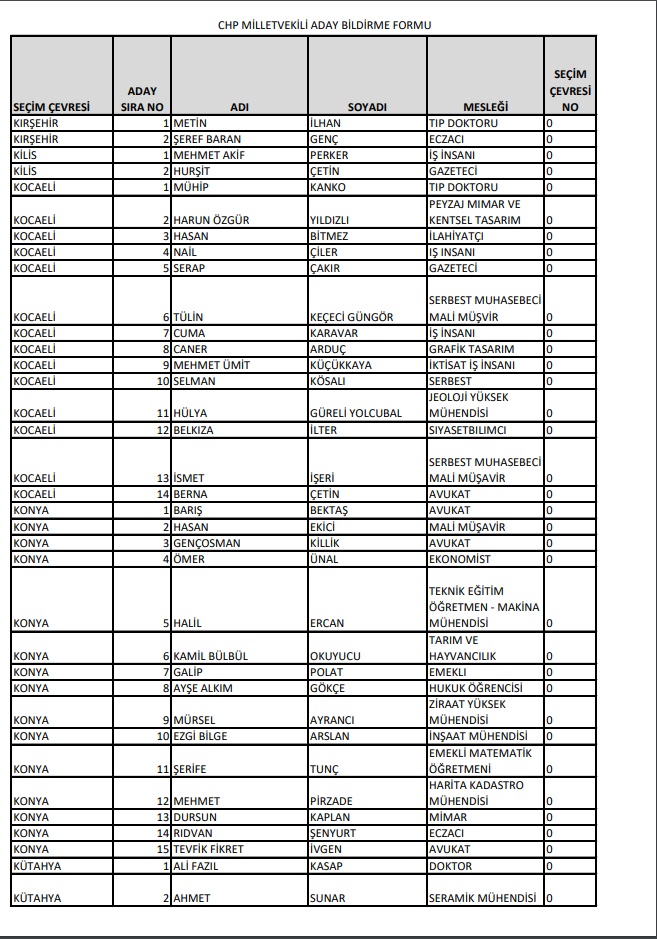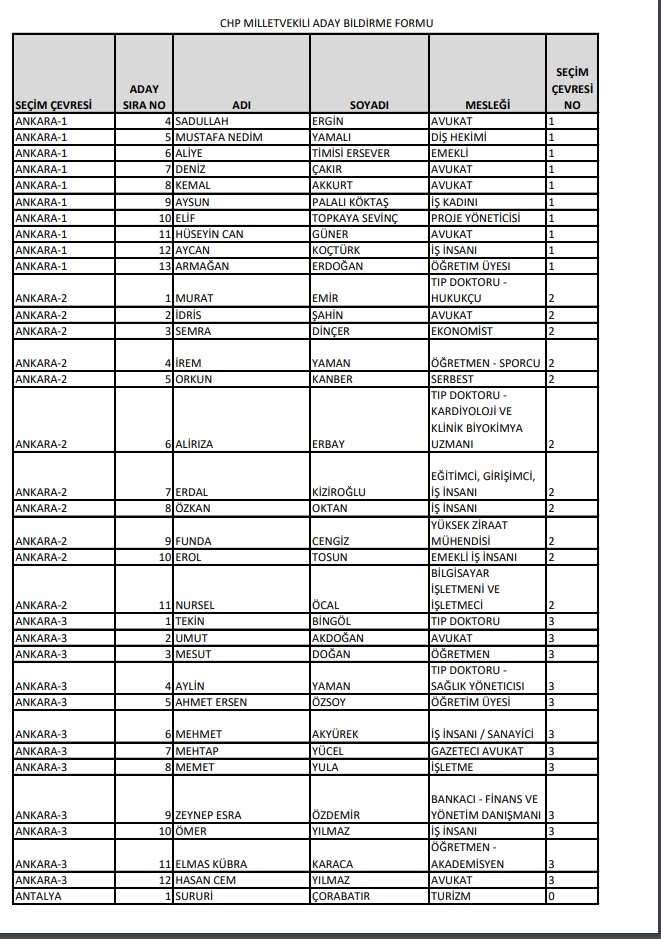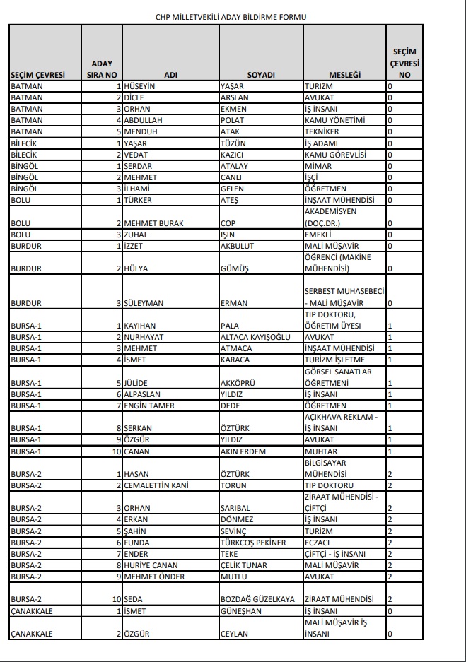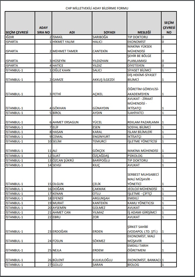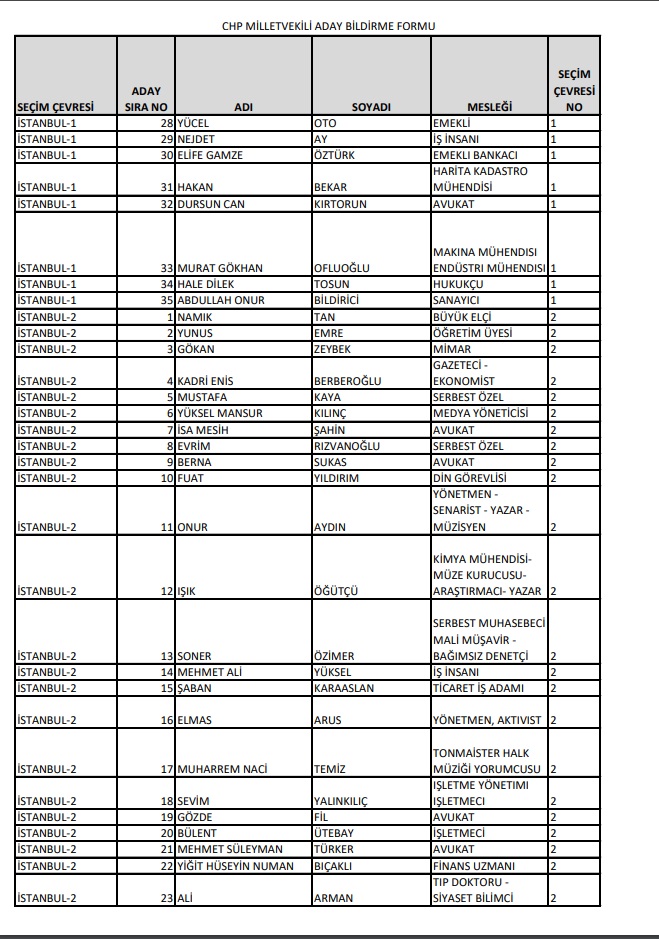 Cumhuriyet Halk Partisi, 14 Mayıs'ta Millet İttifakı 28. Dönem YSK'ya verilen Milletvekili aday listesini yayımladı.