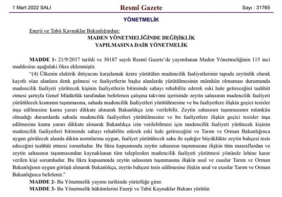 "Kanunla yapamadıklarını yönetmelikle yapıyorlar. Kanuna göre zeytinliklerde madencilik faaliyeti yürütülemez. 1 Martta yönetmeliği değiştirerek Kanunun zeytinlikleri koruyan 20’nci maddesini değiştiriyorlar. Bu TBMM’nin yetkisinin gasp edilmesidir. Bunu iptal edin @fatih_donmez
