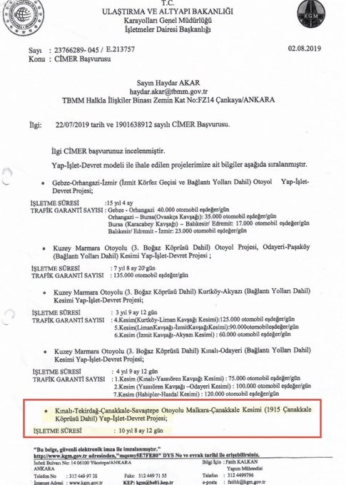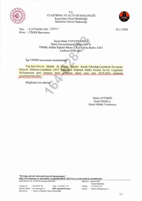 Uygulama sözleşmesindeki bir madde oyunuyla, köprünün kamuya devri için sözleşme süresi sonu olarak 28.05.2034 tarihi belirlendiği içi Köprünün fiili açılış tarihi öne çekildiği halde, kamuya devir tarihi öne çekilmiyor!