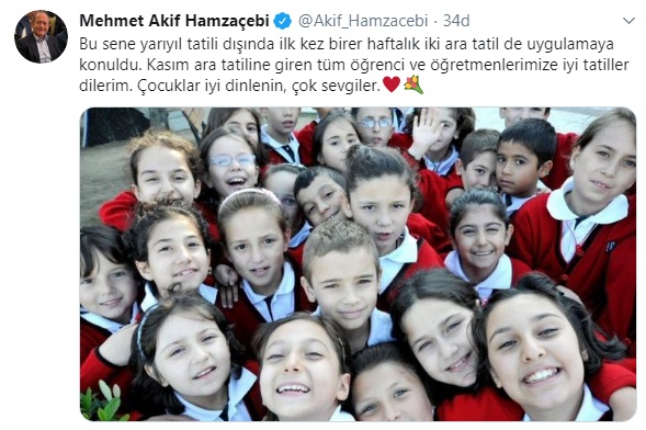 CHP PM üyesi ve İstanbul Milletvekili Mehmet Akif Hamzaçebi Twitter hesabından “Yeni Eğitim Öğretim Çalışma Takvimi Modeli”ne göre 18-22 Kasım’da yapılacak ilk ara tatille ilgili paylaşımda bulundu. Hamzaçebi paylaşımında "Bu sene yarıyıl tatili dışında ilk kez birer haftalık iki ara tatil de uygulamaya konuldu. Kasım ara tatiline giren tüm öğrenci ve öğretmenlerimize iyi tatiller dilerim. Çocuklar iyi dinlenin, çok sevgiler" ifadelerini kullandı.