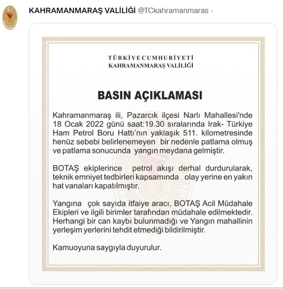 "Kahramanmaraş ili, Pazarcık ilçesi Narlı Mahallesi'nde 18 Ocak 2022 günü saat: 19.30 sıralarında Irak-Türkiye Ham Petrol Hattı'nın yalklaşık 511. kilometresinde henüz sebebi bilinmeyen bir nedenle patlama olmuş ve patlama sonucunda yangın meydana gelmiştir.