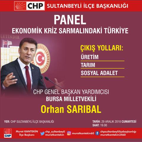 Cumhuriyet Halk Partisi Genel Başkan Yardımcısı ve Bursa Milletvekili Orhan Sarıbal, partisinin Sultanbeyli İlçe Başkanlığı tarafından düzenlenen "Ekonomik kriz sarmalındaki Türkiye" paneline konuşmacı olarak katılacak.