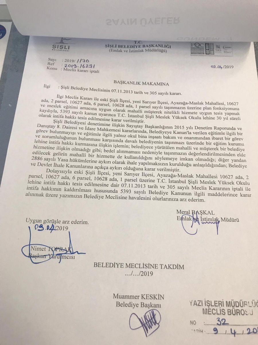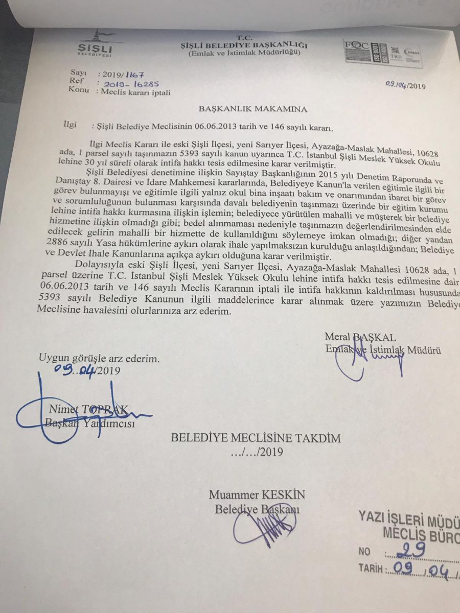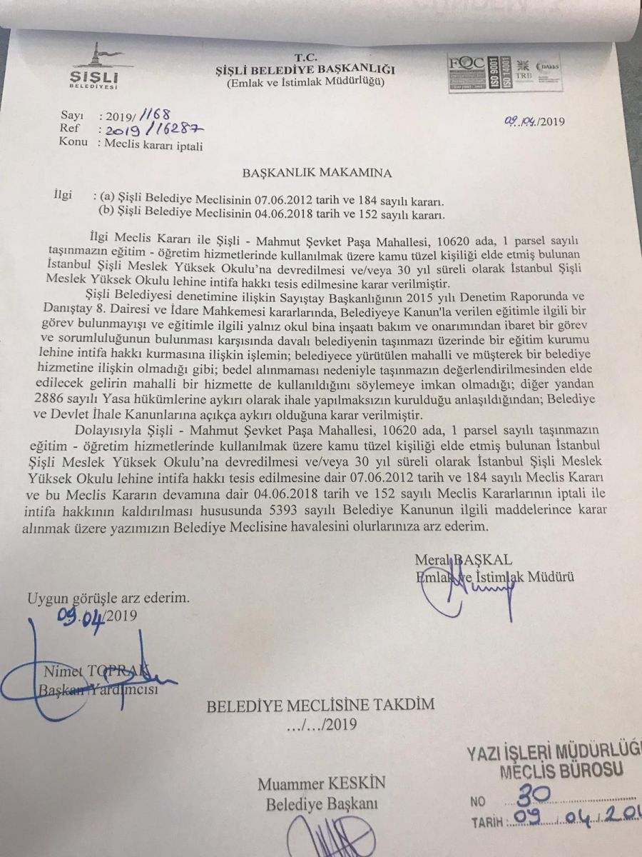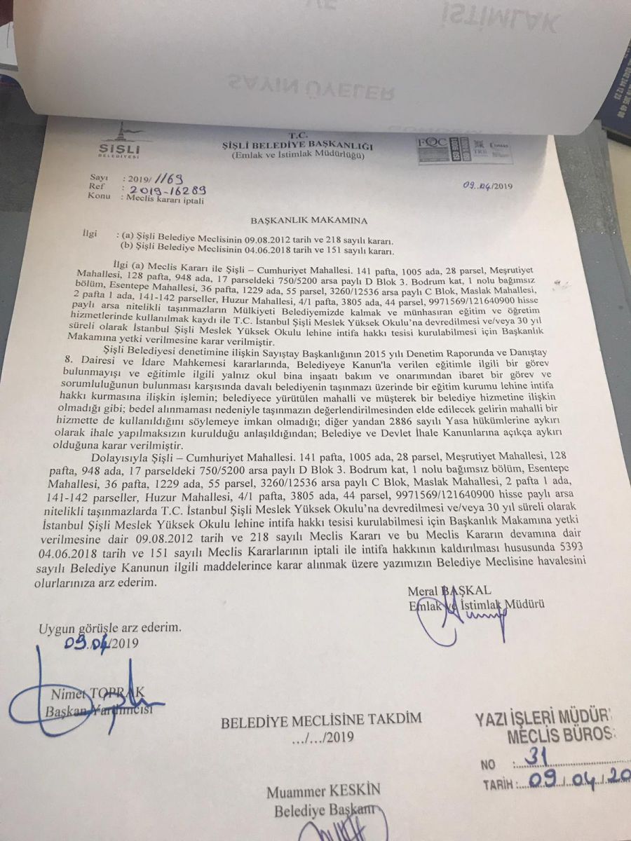 2019 Yerel seçimleri sonrası Şişli belelediyesi meclisi ilk kararı;