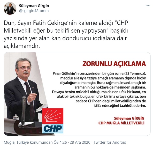 İddiaların ardından CHP Muğla Milletvekili Süleyman Girgin bir açıklama yaptı. Girgin, sosyal medya hesabından yaptığı açıklamada "Pınar Gültekin'in cenazesinden bir gün sonra (23 Temmuz) mağdur ailesiyle taziye amaçlı aramanın dışında hiçbir diyaloğum olmamıştır. Buna rağmen insani amaçlı bir aramanın bu noktaya gelmesinden şaşkınım. Davaya benim müdahil olduğuma dair en ufak bir kanıt, en ufak bir teknik bulgu, en ufak bir ima ortaya çıkarsa ben sadece CHP'den değil milletvekilliğinden de istifa edeceğimi taahhüt ederim" ifadelerini kullandı.