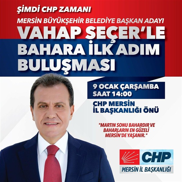 CHP Mersin İl Örgütü tarafından “Mersin Büyükşehir Belediye Başkan adayı Vahap Seçer’le Bahara ilk Adım Buluşması” etkinliği düzenlenecek.