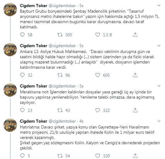 Bayburt Grubu bünyesinde bulunan Şenbay Madencilik A.Ş’nin, gazeteci Çiğdem Toker’in “Tasarruf istiyorsanız metro ihalelerine bakın” başlıklı yazısı nedeniyle açtığı 1.5 milyon liralık manevi tazminat davasının dördüncü duruşması bugün Ankara 13’üncü Asliye Hukuk Mahkemesi’nde görüldü. Mahkeme davacı tarafın katılmaması nedeniyle dosyanın işlemden kaldırılmasına karar verdi.