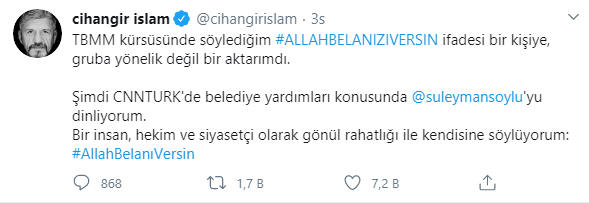 Cihangir İslam paylaşımında; "TBMM kürsüsünde söylediğim #ALLAHBELANIZIVERSIN ifadesi bir kişiye, gruba yönelik değil bir aktarımdı.