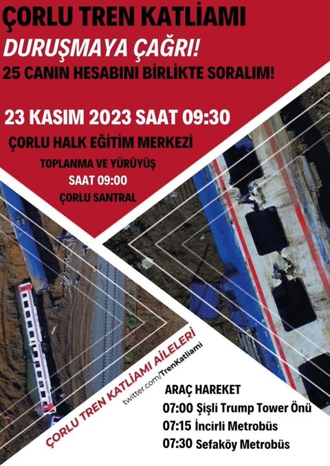 Çorlu Tren Katliamı davasının Çorlu 1. Ağır Ceza Mahkemesi'nde görülen 17. duruşması Halk Eğitim Merkezinde 23 Kasım 2023 Perşembe Saat; 09.30'da görülmeye başlanacak. Aileler her dava öncesi olduğu gibi saat: 09.00'da Santal durağından duruşmanın görüleceği Çaorlu Halk Eğitim Merkezine yürüyecek.
