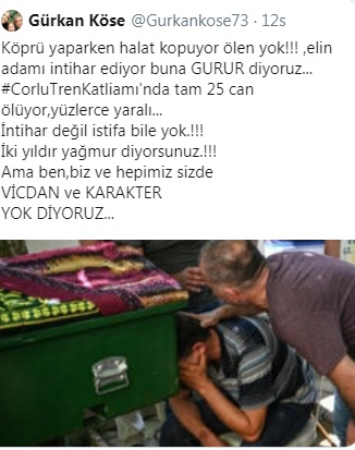 "Şov yapıyorsunuz bile diyebildiler bizlere.!!! Prensesimdi,Canımdı... Bunun şovu,maddi karşılığı varmıdır,olabilirmi sizce.??? #CorluTrenKatliamı'dır bunu herkez duyacak,öğrenecek... Köprü yaparken halat kopuyor ölen yok!!! ,elin adamı intihar ediyor buna GURUR diyoruz... #CorluTrenKatliamı'nda tam 25 can ölüyor,yüzlerce yaralı... İntihar değil istifa bile yok.!!! İki yıldır yağmur diyorsunuz.!!! Ama ben,biz ve hepimiz sizde Vİicdan ve karakter yok diyoruz...