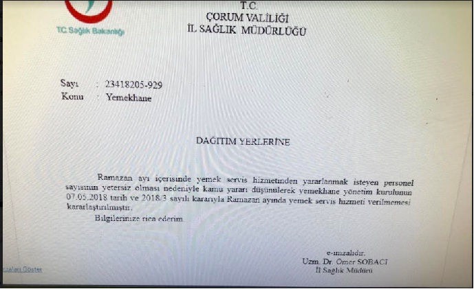 Çorum İl Sağlık Müdürlüğü'nün tüm birimlere gönderdiği yazıda “Ramazan ayı içerisinde yemek servis hizmetlerinden yararlanmak isteyen personel sayısının yetersiz olması nedeniyle kamu yararı düşünülerek yemekhane yönetim kurulunun 07.05.2018 tarih ve 2018/3 sayılı kararıyla Ramazan ayında yemek servis hizmeti verilmemesi kararlaştırılmıştır” ifadeleri yer aldı.