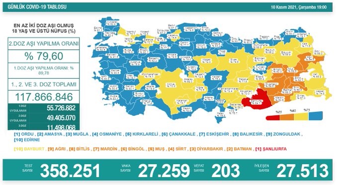 Sağlık Bakanlığı tarafından 10 Kasım 2021 tarihli, Türkiye Günlük Koronavirüs Covid-19 Tablosunun son hali paylaşıldı.