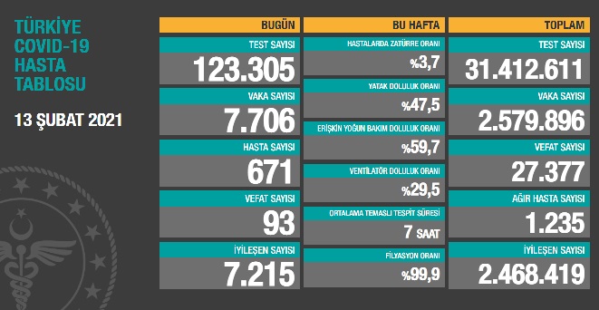 Sağlık Bakanlığı tarafından 13 Şubat 2021 tarihli, Türkiye Günlük Koronavirüs Covid_19 Tablosu paylaşıldı.