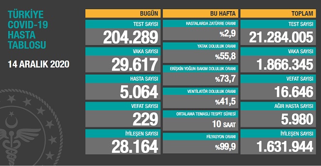 Sağlık Bakanlığı tarafından 14 Aralık 2020 tarihli, Türkiye Günlük Koronavirüs Covid_19 Tablosu paylaşıldı.
