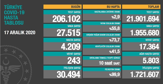 Covid_19 Türkiye'de 17 Aralık'ta 243 toplamda 17.364 can aldı