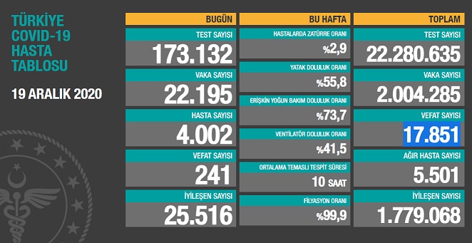 Sağlık Bakanı Dr. Fahrettin Koca, 19 Aralık Sağlık Bakanlığının resmi Türkiye güncel verilerini paylaştı; Pandemi Koronavirüs Covid_19'dan bugün 241, toplamda 17.851 kişi hayatını kaybetti.