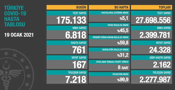 Covid_19, Türkiye'de 19 Ocak'ta 167 toplamda 24.328 can aldı