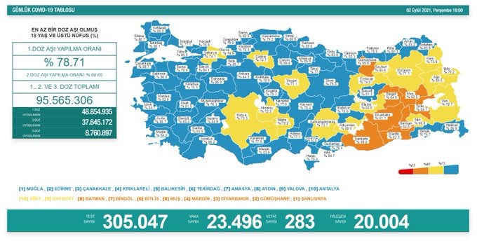 Covid_19, Türkiye'de 2 Eylül'de 283 toplamda 57.278 can aldı