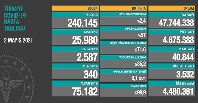 Covid_19, Türkiye'de 2 Mayıs'ta 340 toplamda 40.844 can aldı