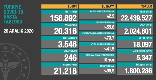 Sağlık Bakanlığı tarafından 20 Aralık 2020 tarihli, Türkiye Günlük Koronavirüs Covid_19 Tablosu paylaşıldı.