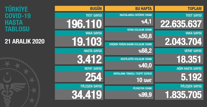 Sağlık Bakanlığı tarafından 21 Aralık 2020 tarihli, Türkiye Günlük Koronavirüs Covid_19 Tablosu paylaşıldı.