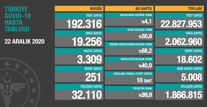 Sağlık Bakanlığı tarafından 22 Aralık 2020 tarihli, Türkiye Günlük Koronavirüs Covid_19 Tablosu paylaşıldı.
