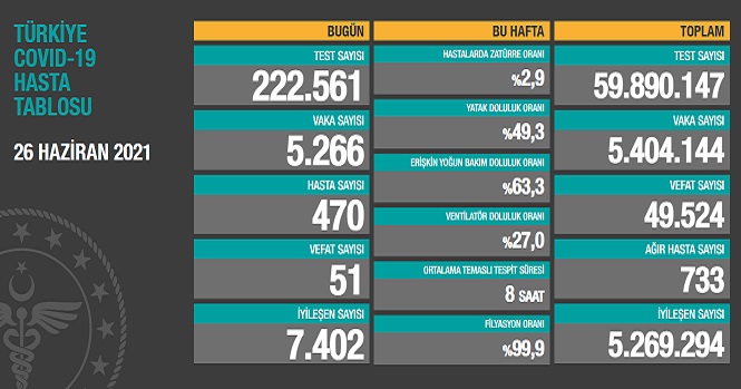Sağlık Bakanlığı tarafından 26 Haziran 2021 tarihli, Türkiye Günlük Koronavirüs Covid_19 Tablosu paylaşıldı.
