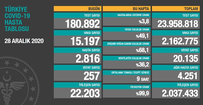 Sağlık Bakanlığı tarafından 28 Aralık 2020 tarihli, Türkiye Günlük Koronavirüs Covid_19 Tablosu paylaşıldı.