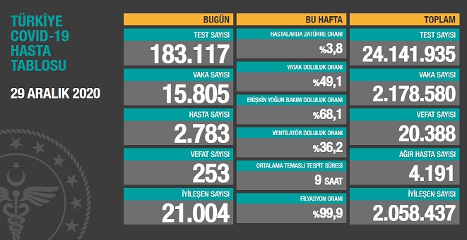 Sağlık Bakanlığı tarafından 29 Aralık 2020 tarihli, Türkiye Günlük Koronavirüs Covid_19 Tablosu paylaşıldı.